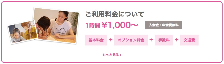 | スポット | ・1,000円〜/1時間 基本料金(サポーターの時給×時間) +オプション料金 (2人目保育料、家事・料理など) +手数料 (基本料金とオプション料金の合計より10%) +交通費 (サポーターの交通費を実費負担) |