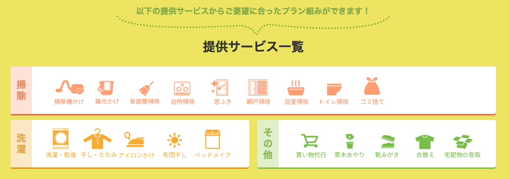 一般的な家事の代行をする生活サポートプランの他にも、病院などの付き添いをするお出かけサポートプラン、身体サポートプラン、安否確認プランなど、様々なプランが用意されています。