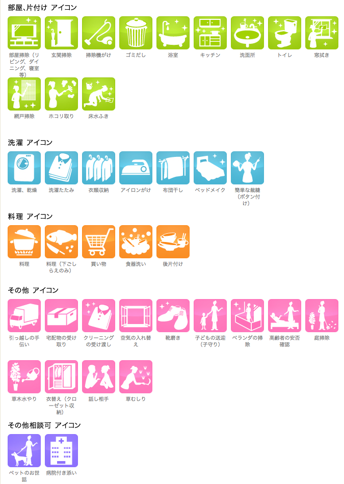 | 定期契約 | スタンダードコース 週1日2時間〜:1,815円/1時間 ・非専任スタッフ ・在宅時のみサービス可能 プレミアムコース 週1日2時間〜:2,024円(税込)/1時間 ・専任スタッフ ・不在時対応可能 |